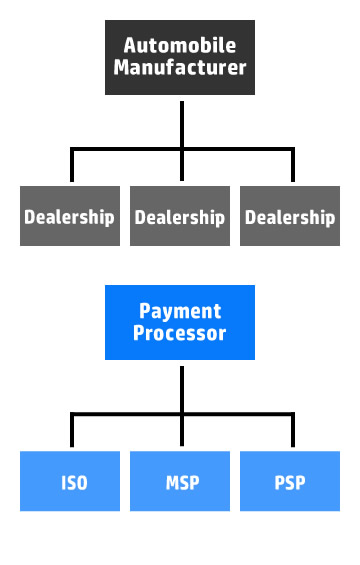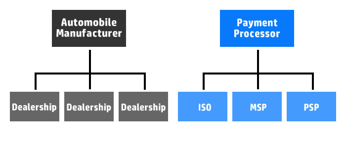 To understand the differences between a Payment Processor, Merchant Service Provider, ISO, MSP or PSP; look at the Payment Processor as an automobile manufacturer of cars and the ISO, MSP, and PSP as the car dealerships for the manufacturer. The automobile manufacturer (Payment Processor) is the source and the car dealerships (ISO, MSP and PSP) are the third party vendors who have been approved to sell services or products.
